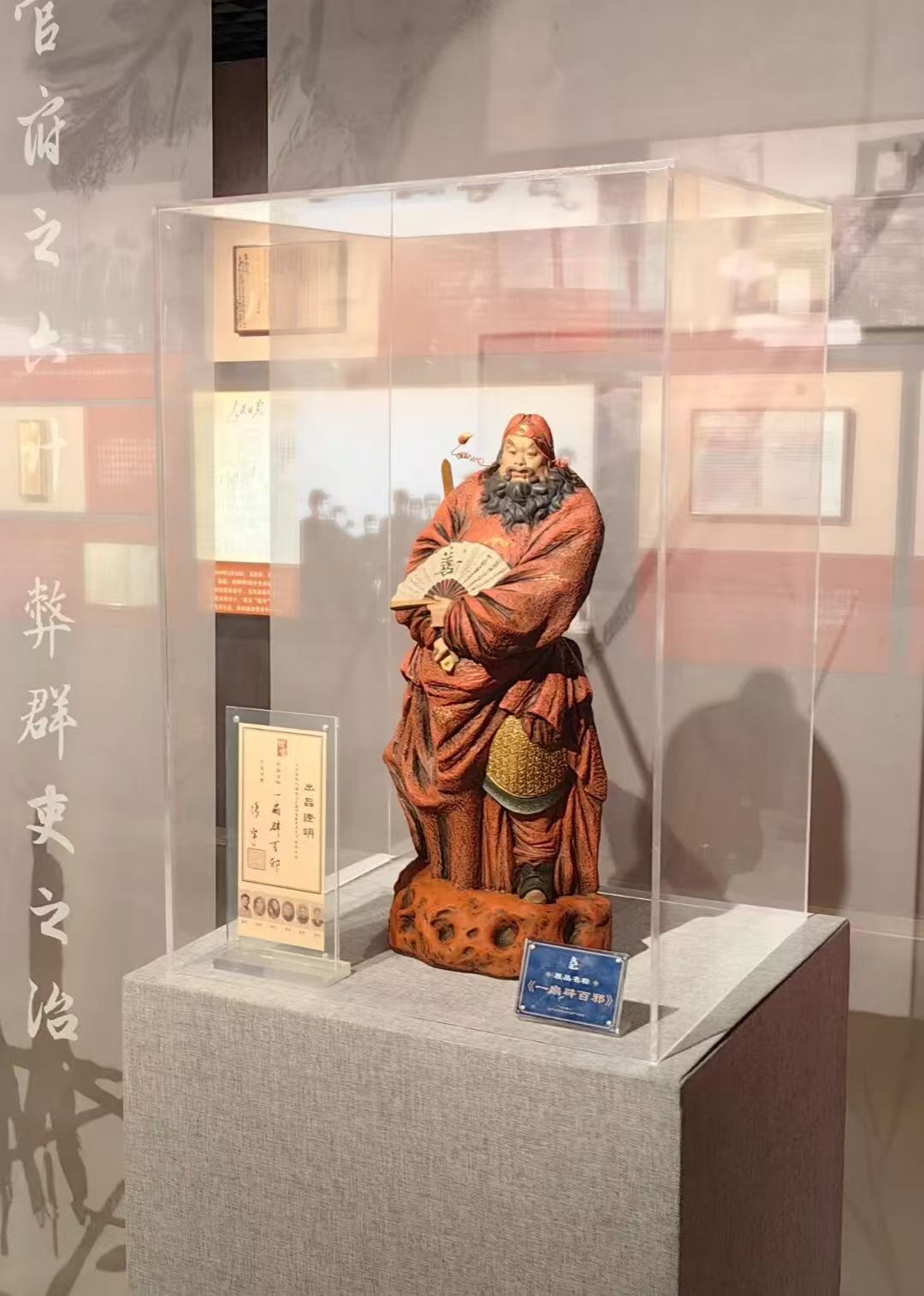 一正辟三邪,人正辟百邪。在泥塑作品“一扇(善)辟百邪”中,钟馗像身着官袍,祥瑞威仪;一手持扇(善),正心诚意,神明自得;一手执剑,惩恶扬善,百邪不侵。世人信钟馗,因其多行善举,惩奸除恶,以正风气,身正则心念定,不惧危难邪祟,护佑一方。